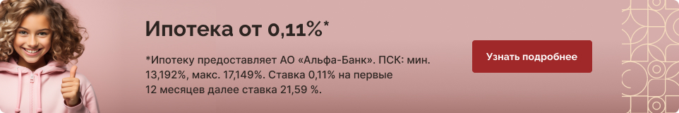 *Ипотеку предоставляет АО «Альфа-Банк». Полная стоимость кредита: мин. 13,192%, макс. 17,149%. Ставка 0,11% на первые 12 месяцев далее ставка 21,59 %.При первоначальном взносе не менее 20,1%, срок кредита от 3 до 30 лет. Программа действует при покупке квартиры у партнёра АО «Альфа-банк» при сумме кредита от 600 тысяч до 70 миллионов рублей в Москве и Московской обл, г. Санкт-Петербурга и Ленинградской области, для иных регионов до 35 млн руб, при наличии личного страхования заемщика. Подробнее на alfabank.ru. АО «Альфа-Банк», ген. лицензия ЦБ РФ №1326 от 16.01.2015.